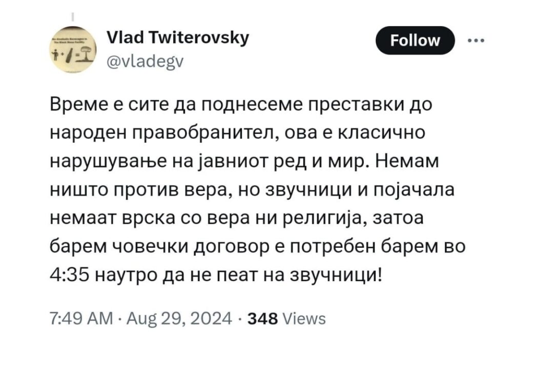 “Është koha që të gjithë ne të paraqesim ankesa tek Avokati i Popullit, kjo është shkelje klasike e rendit dhe qetësisë publike. Nuk kam asgjë kundër besimit, por altoparlantët dhe amplifikatorët nuk kanë lidhje me besimin apo fenë, ndaj të paktën duhet një marrëveshje njerëzore të paktën në orën 4:35 të mëngjesit për të mos kënduar në altoparlantë! – reagon një tjetër shkupjan me kombësi maqedonase.