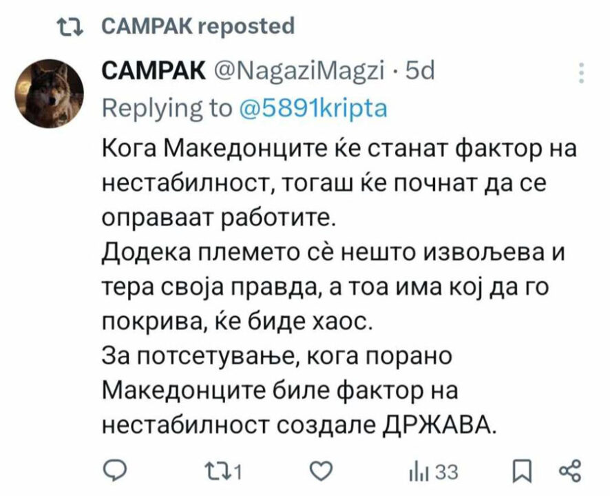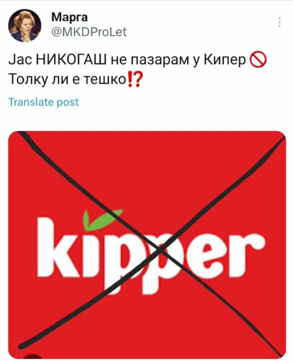 “Thjeshtë bojkoto, mos u fut në Kiper. E sheh emrin ‘Kiper’ dhe mos u fut. Është shumë e thjeshtë. Të mos flasim pastaj që, përveç që flitet shqip, janë edhe muslimanë dhe nuk mbajnë asnjë lloj alkooli apo mish derri”, shkruan një profil me emrin “Samrak” e që mbështet politikat e VMRO-së.
