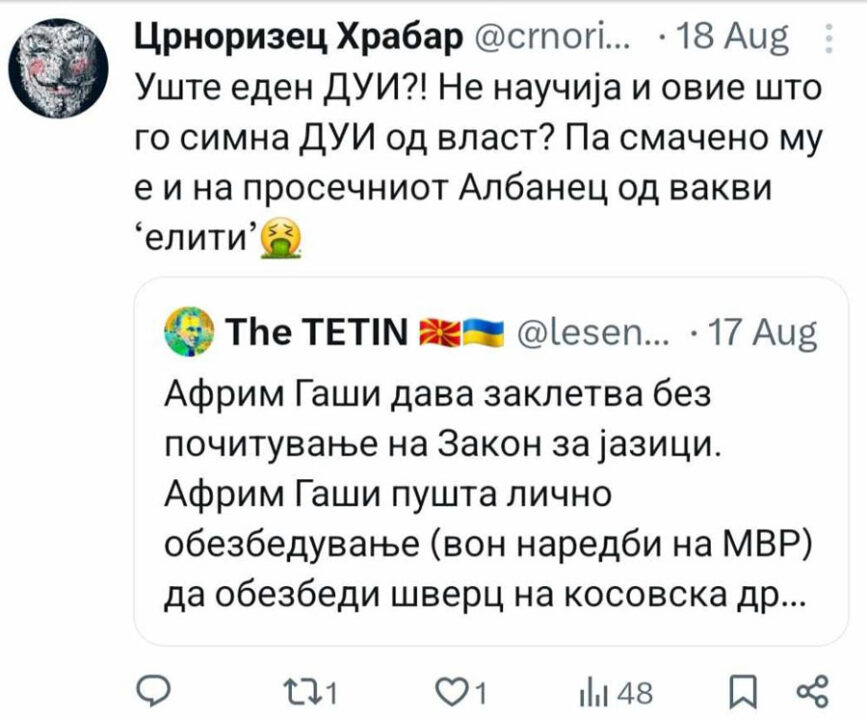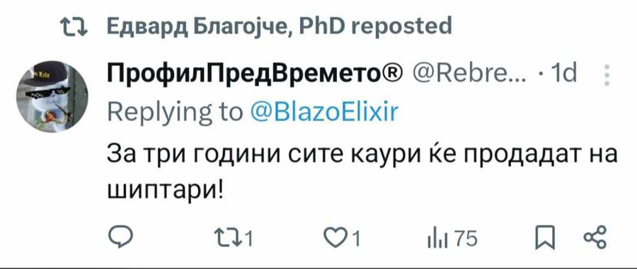 Është partneri i koalicionit të VMRO-së në Qeverinë e re, Petar Bogoevski nga Lëvizja “Koncepti Maqedonas” që për çdo ditë ofendon dhe fyen shqiptarët. Pothuajse në secilin postim i njëjti përdorë shprehjen fyese “shqiptari”.