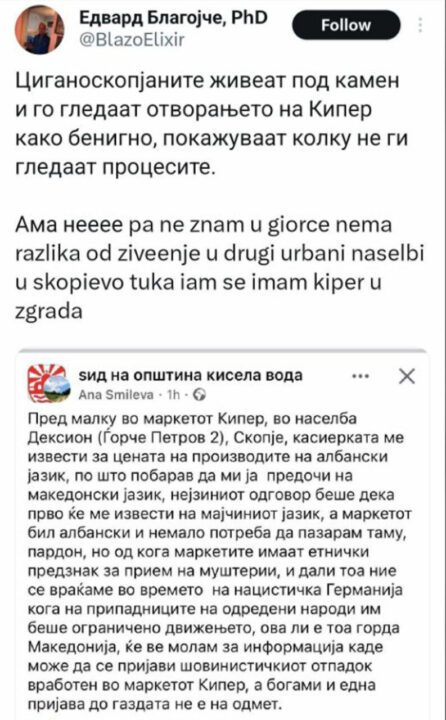 “Para një kohë, në marketin ‘Kiper’ në lagjen Gjorçe Petrov’, punonjësja në arkë mi tregonte çmimet në gjuhën shqipe. I kërkova fillimisht të flas maqedonisht, por më tha se gjuhë amë e ka shqipen dhe se marketi është me pronarë shqiptarë. Kështu që dola dhe i lash produktet e zgjedhura. Nuk është e vështirë, bëjeni edhe ju këtë…”, shkruan një tjetër profil që proklamon Maqedoninë njëetnike dhe politikat e VMRO-së.